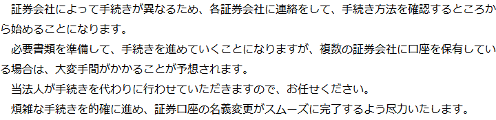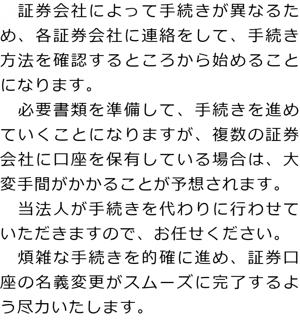 また、証券口座の解約・名義変更を依頼いただくことで、行政書士が依頼者の方の代わりに手続きを進めることもできます。