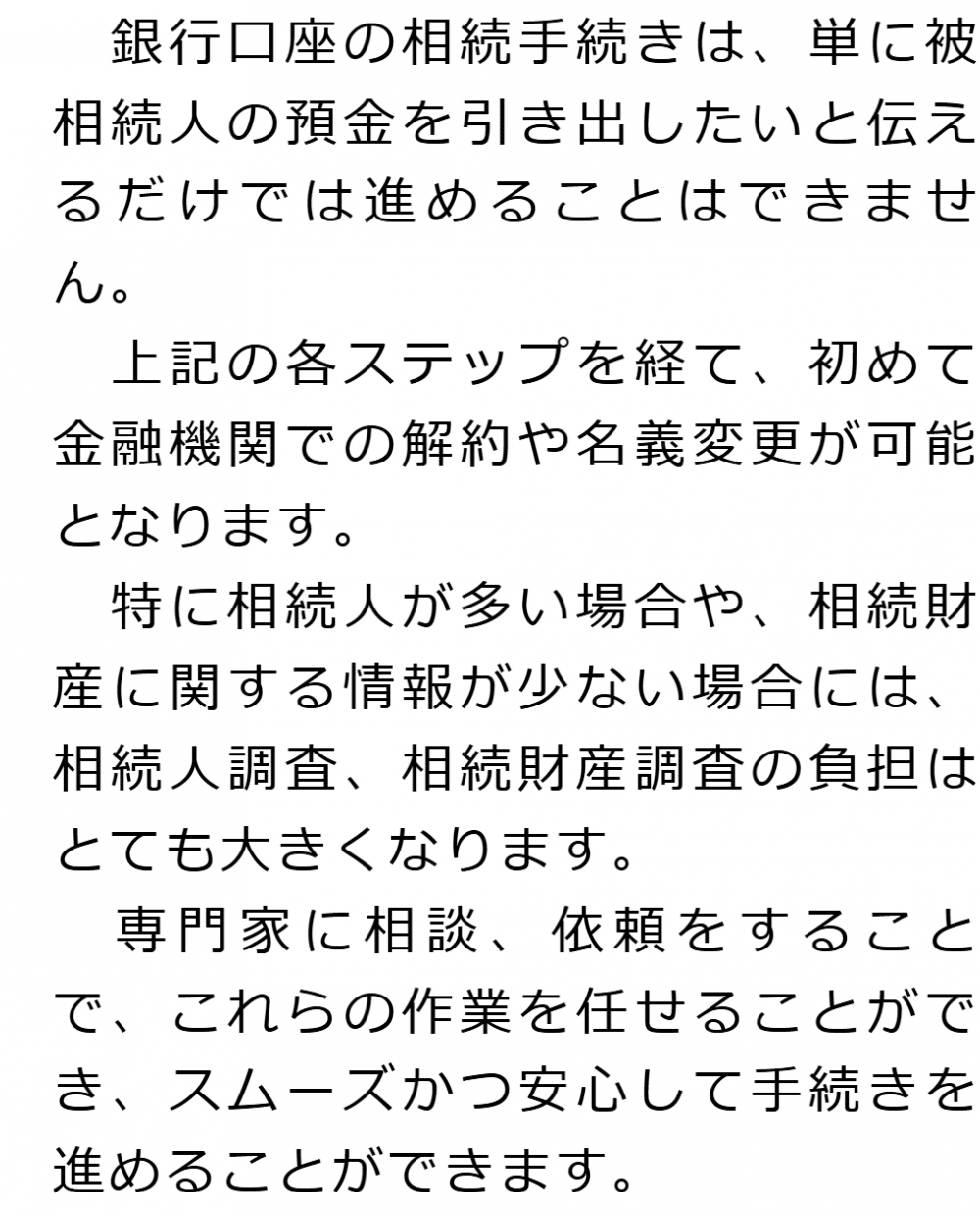 1 銀行口座の相続手続きの概要 2 相続人を確定する(相続人調査) 3 預貯金を含めた相続財産を把握する(相続財産調査) 4 相続人全員で分け方を決める(遺産分割協議) 5 金融機関における預貯金の解約・名義変更 6 相続手続きは専門家に相談・依頼することをおすすめします