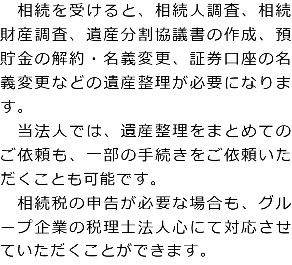 ご家族が亡くなるなどして遺産を相続した場合、相続財産・相続人の調査や遺産分割協議書の作成、預貯金・有価証券口座の解約・名義変更などの遺産整理が必要になります。