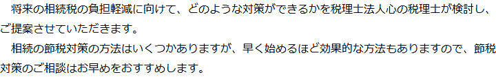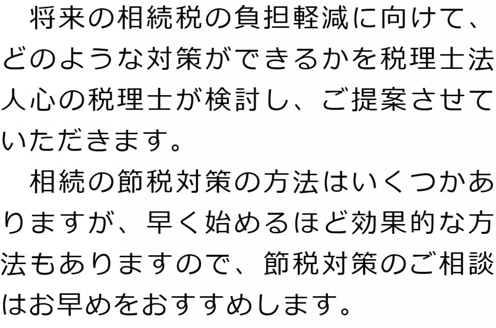 トップ業務内容節税対策 階層構造▼ 業務内容(目次) 節税対策 業務内容(目次)業務内容トップ行政書士法人心の業務内容遺言遺産整理相続人調査相続財産調査遺産分割協議書の作成預金・貯金の解約・名義変更証券口座の解約・名義変更自動車の名義変更心グループのその他の業務内容家族信託・民事信託節税対策事業承継遺言の検認相続放棄限定承認遺産分割遺留分侵害額請求相続登記相続税申告相続税調査 受付時間 平日 9時~21時、土日祝 9時~18時 夜間・土日祝の相談も対応します (要予約) 所在地 〒163-0990 東京都新宿区西新宿2-3-1新宿モノリスビル地下1F 0120-2403-39 お問合せ・アクセス・地図