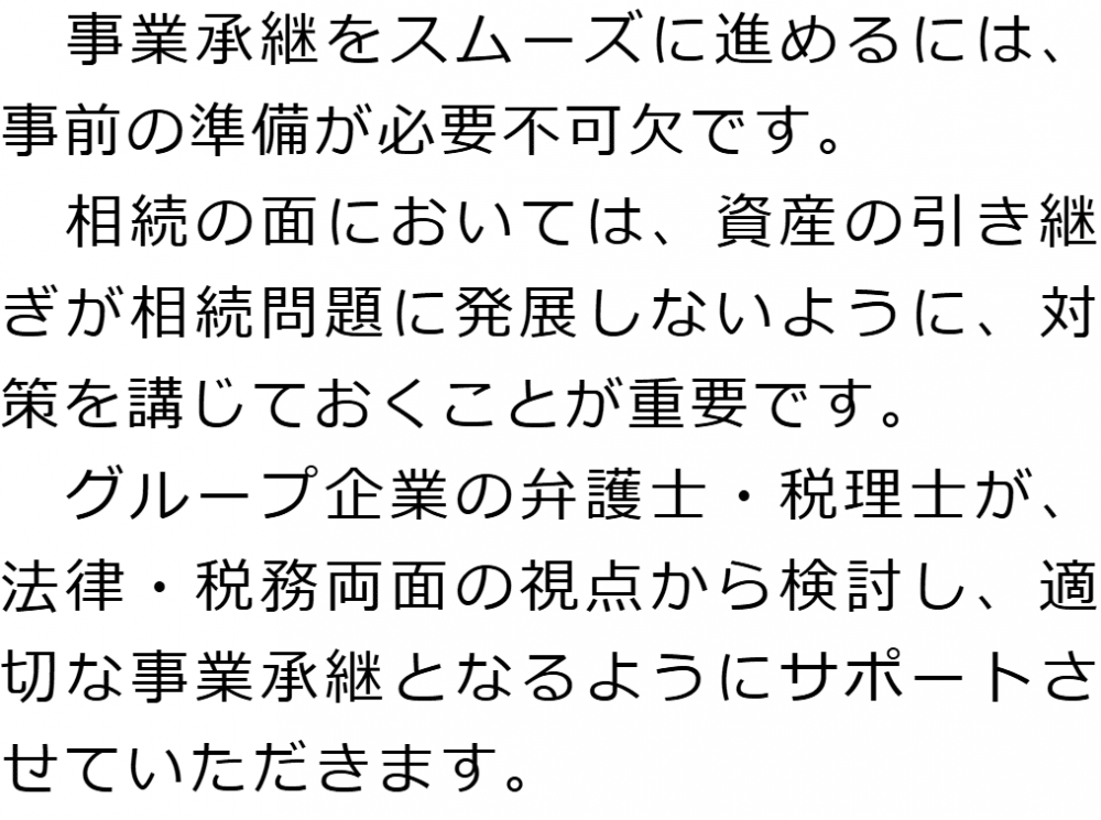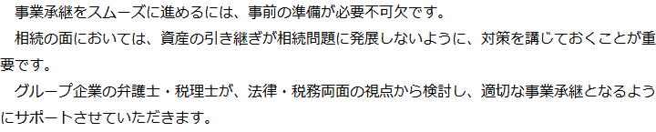トップ業務内容事業承継 階層構造▼ 業務内容(目次) 事業承継 業務内容(目次)業務内容トップ行政書士法人心の業務内容遺言遺産整理相続人調査相続財産調査遺産分割協議書の作成預金・貯金の解約・名義変更証券口座の解約・名義変更自動車の名義変更心グループのその他の業務内容家族信託・民事信託節税対策事業承継遺言の検認相続放棄限定承認遺産分割遺留分侵害額請求相続登記相続税申告相続税調査 受付時間 平日 9時~21時、土日祝 9時~18時 夜間・土日祝の相談も対応します (要予約) 所在地 〒163-0990 東京都新宿区西新宿2-3-1新宿モノリスビル地下1F 0120-2403-39 お問合せ・アクセス・地図