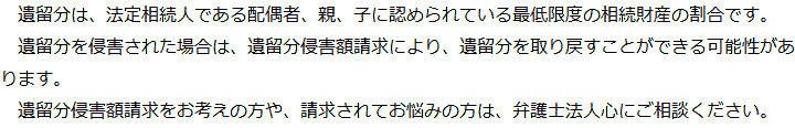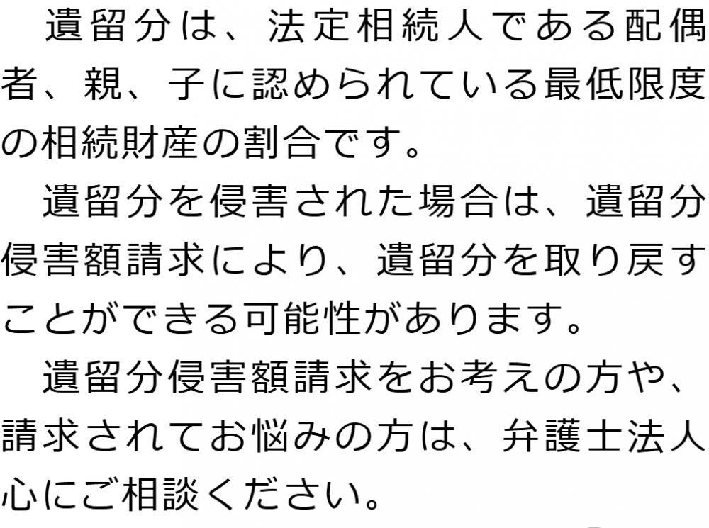 トップ業務内容遺留分侵害額請求 階層構造▼ 業務内容(目次) 遺留分侵害額請求 業務内容(目次)業務内容トップ行政書士法人心の業務内容遺言遺産整理相続人調査相続財産調査遺産分割協議書の作成預金・貯金の解約・名義変更証券口座の解約・名義変更自動車の名義変更心グループのその他の業務内容家族信託・民事信託節税対策事業承継遺言の検認相続放棄限定承認遺産分割遺留分侵害額請求相続登記相続税申告相続税調査 受付時間 平日 9時~21時、土日祝 9時~18時 夜間・土日祝の相談も対応します (要予約) 所在地 〒163-0990 東京都新宿区西新宿2-3-1新宿モノリスビル地下1F 0120-2403-39 お問合せ・アクセス・地図
