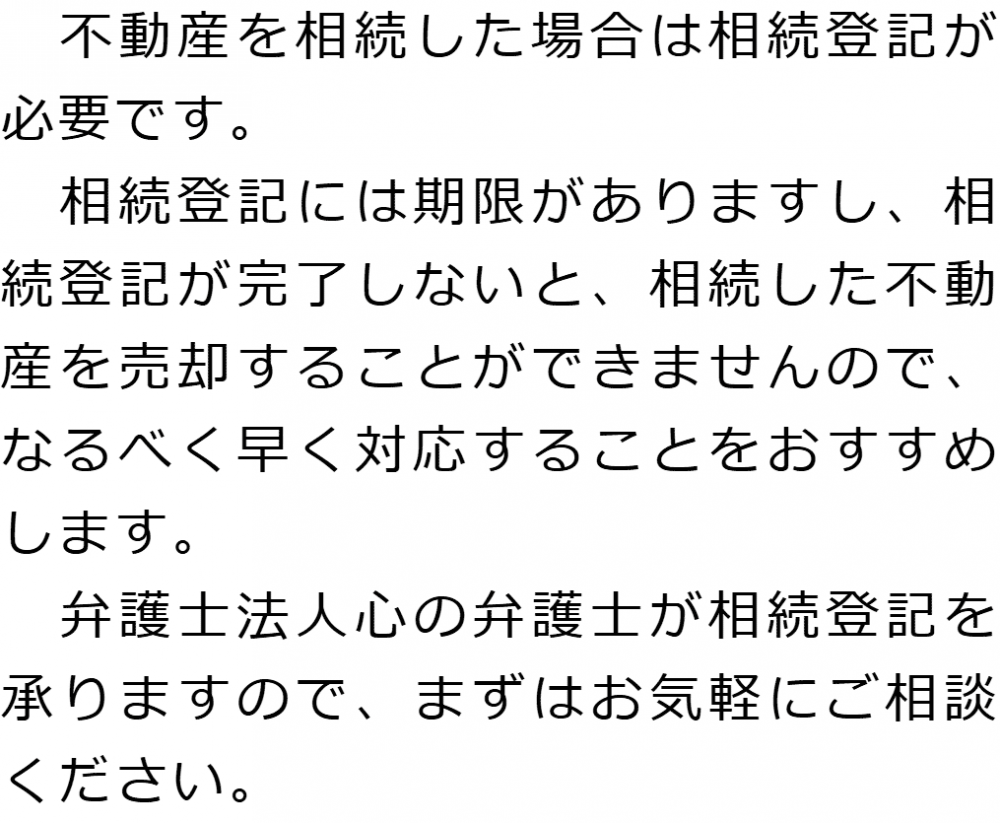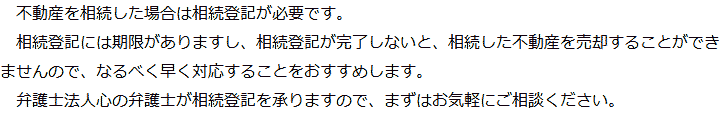 トップ業務内容相続登記 階層構造▼ 業務内容(目次) 相続登記 業務内容(目次)業務内容トップ行政書士法人心の業務内容遺言遺産整理相続人調査相続財産調査遺産分割協議書の作成預金・貯金の解約・名義変更証券口座の解約・名義変更自動車の名義変更心グループのその他の業務内容家族信託・民事信託節税対策事業承継遺言の検認相続放棄限定承認遺産分割遺留分侵害額請求相続登記相続税申告相続税調査 受付時間 平日 9時~21時、土日祝 9時~18時 夜間・土日祝の相談も対応します (要予約) 所在地 〒163-0990 東京都新宿区西新宿2-3-1新宿モノリスビル地下1F 0120-2403-39 お問合せ・アクセス・地図